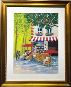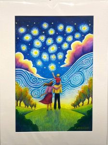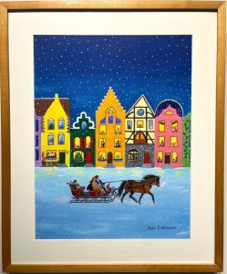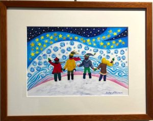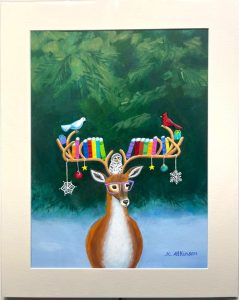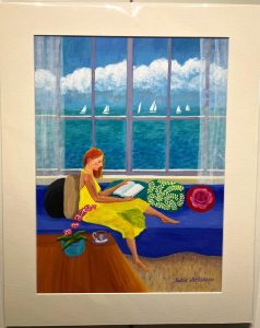 Katie’s exhibit includes work from her 30 years as an illustrator. “Doing the kind of work I love started when our two boys were very young…Seeing our boys’ love of winter inspired new paintings, and I developed my whimsical children’s-book kind of style. I enjoy painting scenes that are colorful, playful and inspiring.” Happily for us, many of Katie’s pieces also celebrate the joy of reading!
